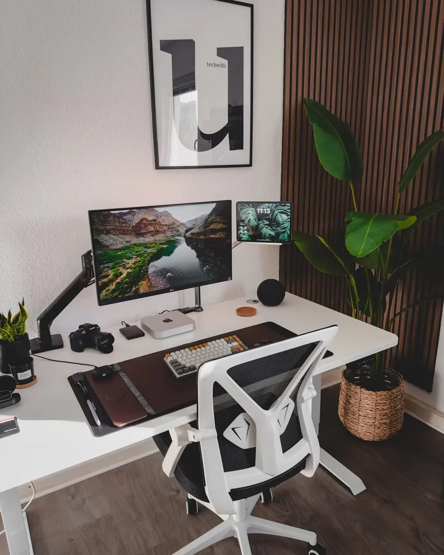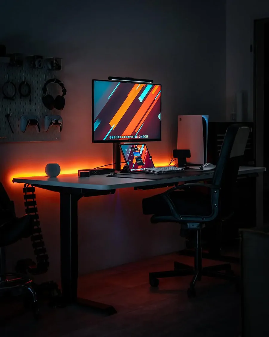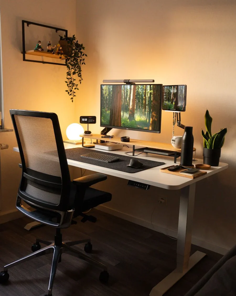 The ideal desk height varies from person to person, but a general guideline is that your desk should be at elbow height when sitting, and the top of your monitor should be at eye level to avoid strain. When standing, your desk should align with your bent elbows.